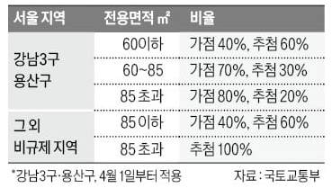 놀라운 것이 강남3구 및 용산구에서 85m² 이하는 점수제 백퍼였어요. 저긴 누구나 꿈꾸는 지역이니 만약 추첨제를 넣으면 너도나도 신청해서 경쟁률이 치솟겠죠. 그런데 지금은 부동산 시장이 죽고 미분양이 지속되다보니 4월 1일부터 추첨제도 일부 넣는다는 거예요.