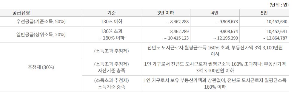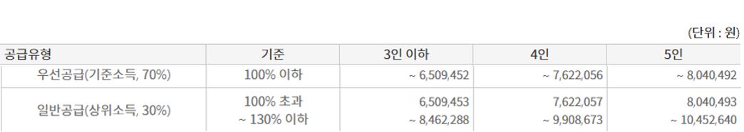 자, 이제 소득이 중요합니다. 아래 표에서 가구당 월평균 소득의 160퍼센트이하까지는 우선+일반(70%)자격으로 신청하면 돼요. 근데 160퍼센트를 초과한다! 그렇다면 추첨(30%)에 넣어야 해요. 일명 뺑뺑이죠.